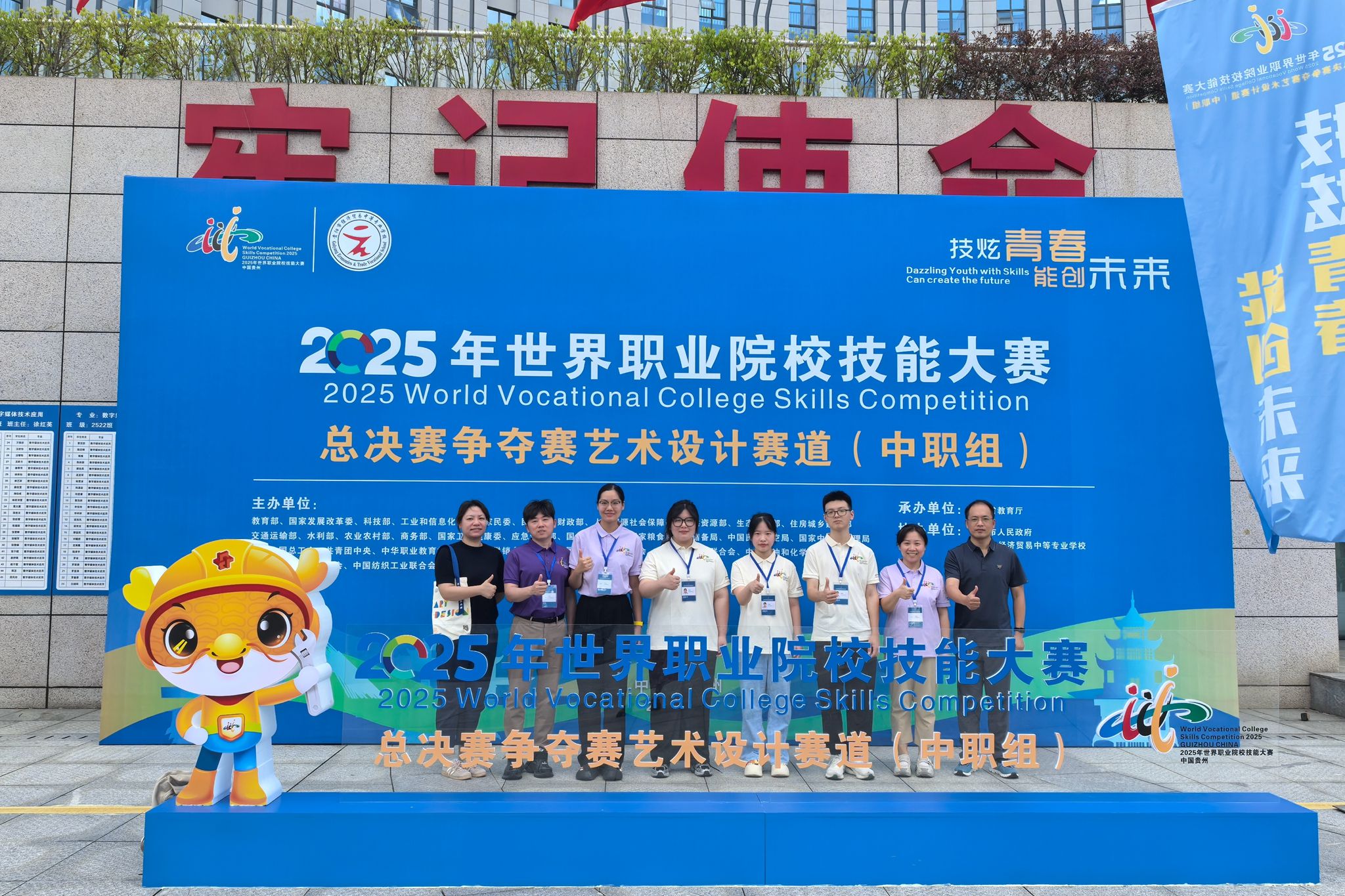 8月23-29日,2025年世界职业院校技能大赛总决赛争夺赛(中职组)艺术设计赛道在贵阳举行。由信息艺术系谢嘉琪、钟雨露、宗新睿组成的学生团队,在学校副校长薛飞带队,沙牧秋、蒋云娇老师指导下,凭借精湛技艺与默契协作,从全国114支参赛队中脱颖而出,斩获银奖。